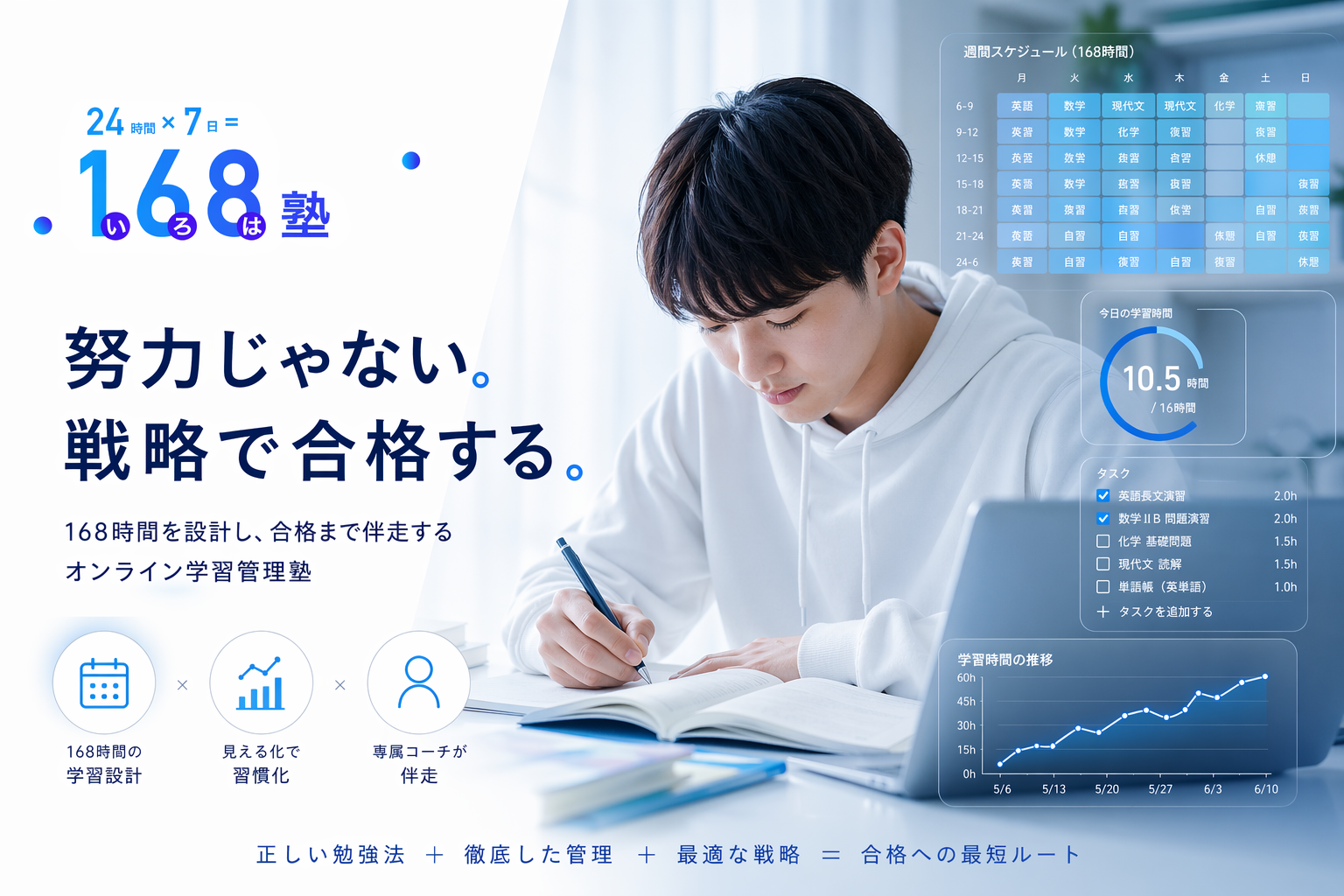 168塾は、1週間=168時間すべてで生徒を支えることを目指す、新しい学習塾です。プロのコーチが学習戦略と日々の計画を設計し、専用アプリで進捗を毎日確認・フィードバック。部活やプライベートも尊重しながら、限られた時間で成果を出す学習を実現します。