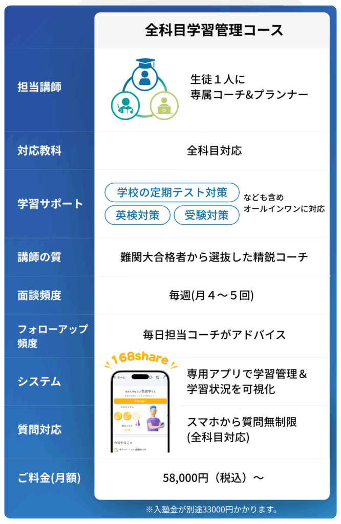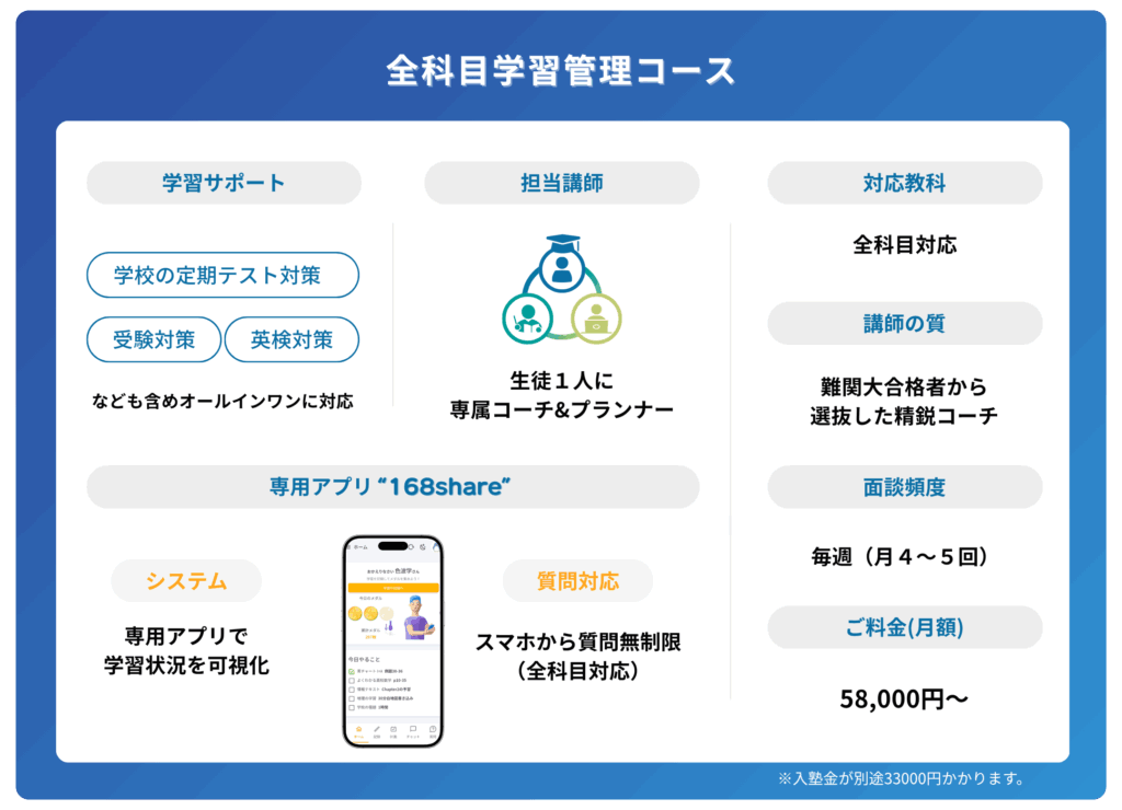 168塾は「1つのコース」で、全科目・すべての受験対策に対応。