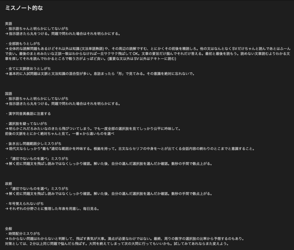 また、弱点管理として、間違えた問題を全部タイピングしてパソコンに入力し、見返し続けるという方法を取っていました。だいたい100問以上は記録していたと思います。