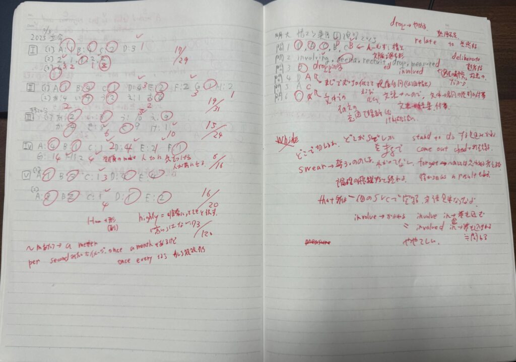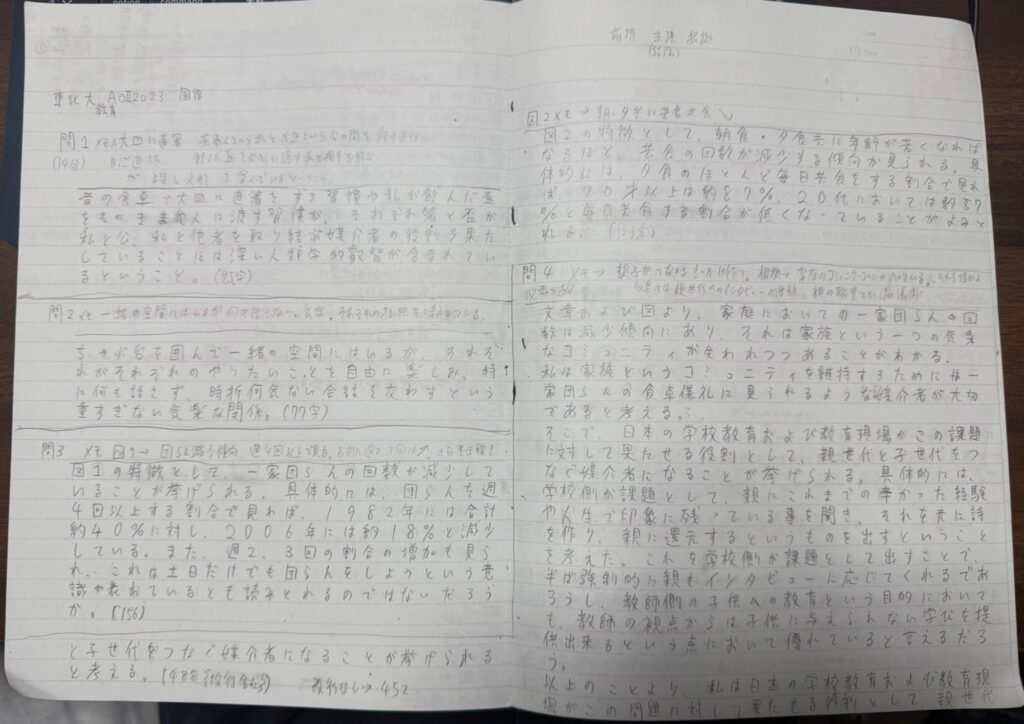 国語は、小論文と資料読解が中心で、元から得意でした。添削を頼み、フィードバックをもらいながら弱点をつぶしていきました。また、弱点ノートを自分で作って、論理的思考力を鍛えることを意識して取り組んでいました。