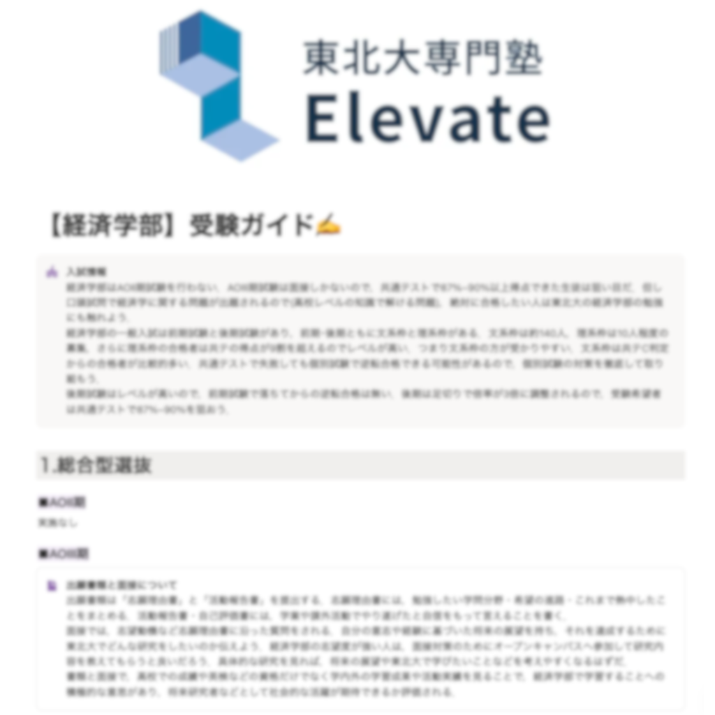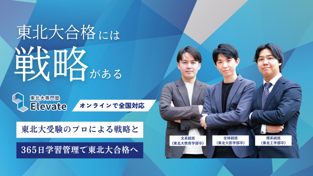 東北大合格に特化したオンライン専門塾である「Elevate」は、一般的な個別指導塾とは異なります。東北大受験に特化した「入試から逆算した長期的な学習戦略」と「東北大コーチからの毎日の学習アドバイス」で合格に導きます。